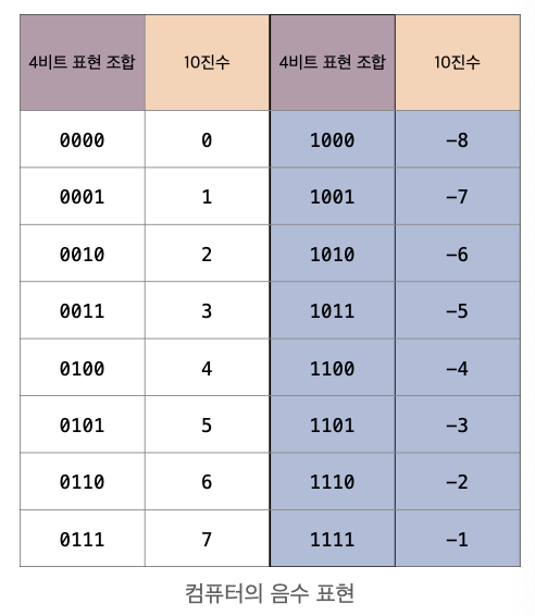 - 컴퓨터는 n비트에서 가장 왼쪽의 비트(최상위 비트)를 부호 비트로 사용하여 음수를 표현한다.