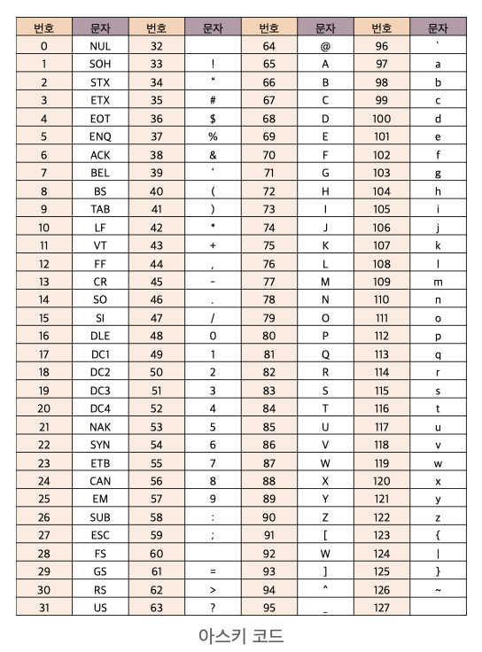 - 128개의 모든 조합을 제공하는 7비트 부호