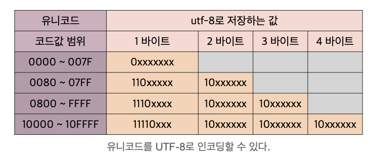 - 인코딩 결과는 1 ~ 4바이트가 가능